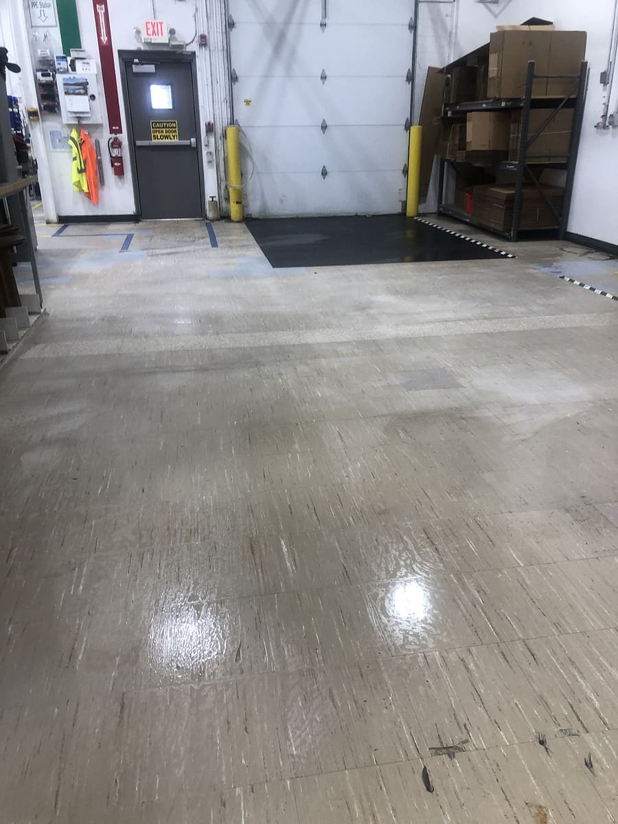 • Regular Stripping and Waxing: Periodically, VCT floors in industrial spaces require stripping the old wax and applying a new layer. This process rejuvenates the shine and provides essential protection for the flooring. Our professional industrial floor stripping and waxing services to ensure your business space maintains a polished and inviting appearance.